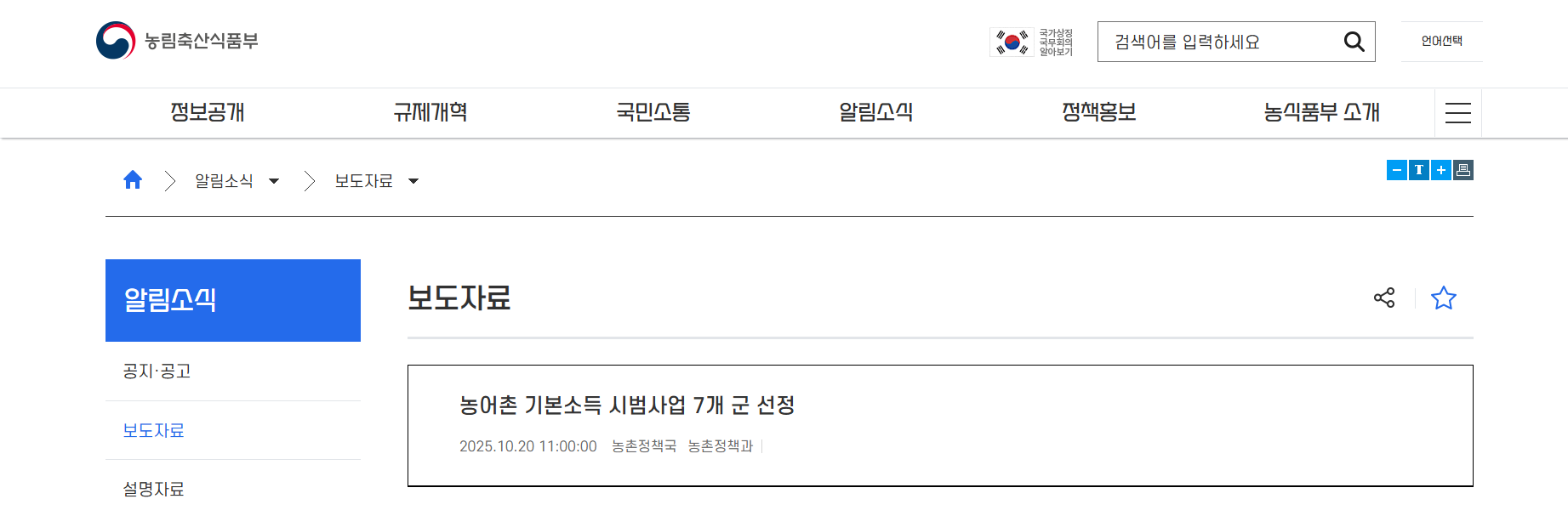 농림축산식품부 홈페이지 또는 정책브리핑 등 공식 채널의 보도자료 섹션에서 농어촌 기본소득 시범사업 선정 관련 발표 자료를 검색하는 것이 가장 공식적이고 정확합니다.